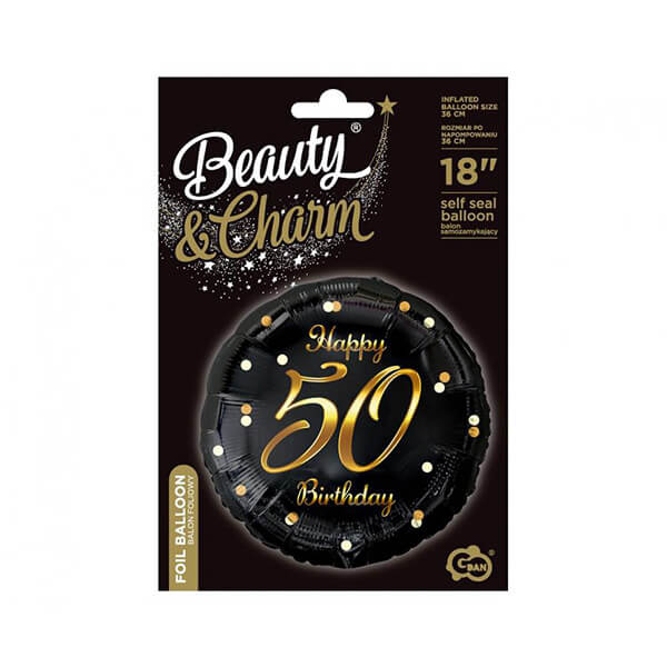 Фолиев балон с надпис, Happy 50 Birthday, черен, златен печат, 45 см