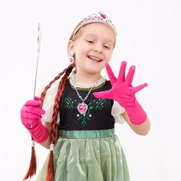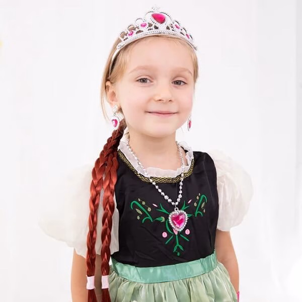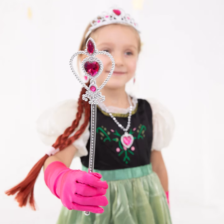 Комплектът включва пластмасови диаманти, които придават блясък и елегантност. Короната и магическата пръчка със сигурност ще привлекат вниманието на всеки малък фен на Frozen. Освен това не са пропуснати и дребни детайли като ръкавици, обеци и изкуствена плитка, прикрепена с ластик и щипка. Това е всичко, от което се нуждаете, за да създадете магическа визия, вдъхновена от любимия ви анимационен герой.