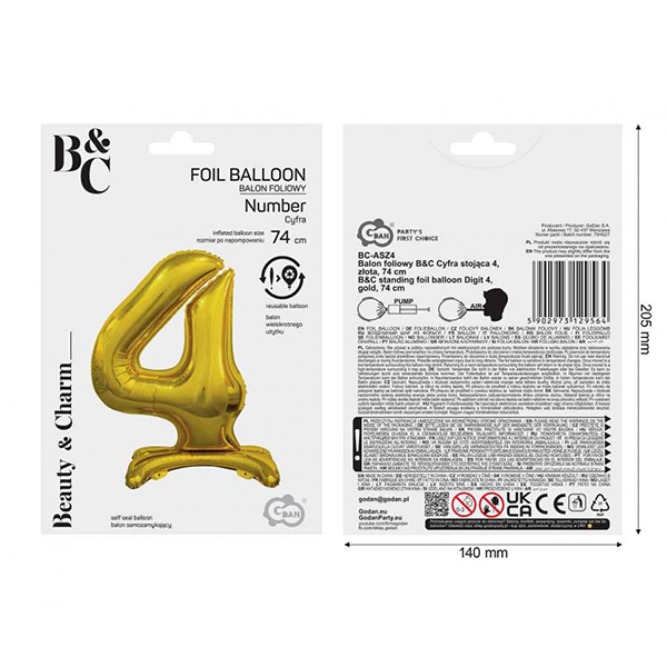 Балон фолиев Цифра 4, стоящ, B&C, злато, 74 cm