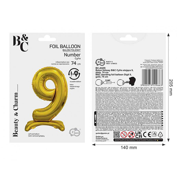 Балон фолиев Цифра 9, стоящ, B&C, злато, 74 cm