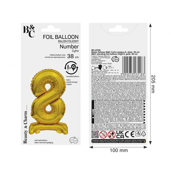 Балон фолиев стояща Цифра 8, B&C, злато, 38 cm
