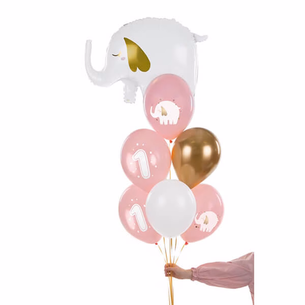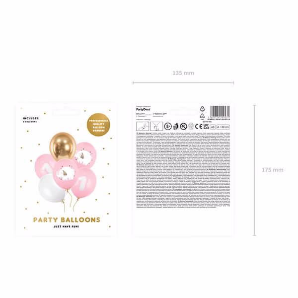 Красиви и здрави балони за Една година, комплектът съдържа 6 балона (2 в пастелен бледорозов цвят с пъстра щампа, 2 в пастелен бледорозов цвят с бял принт, 1 в пастелен чисто бял цвят и 1 в цвят лъскаво злато), диаметър прибл. 30 см.