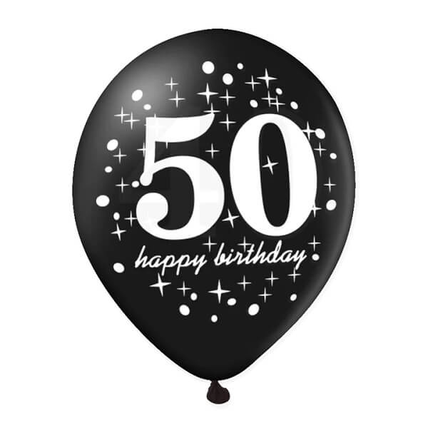 Балони за 50-ти рожден ден златисто- черни, с печат, конфети и надпис с цифри 50, 6 броя