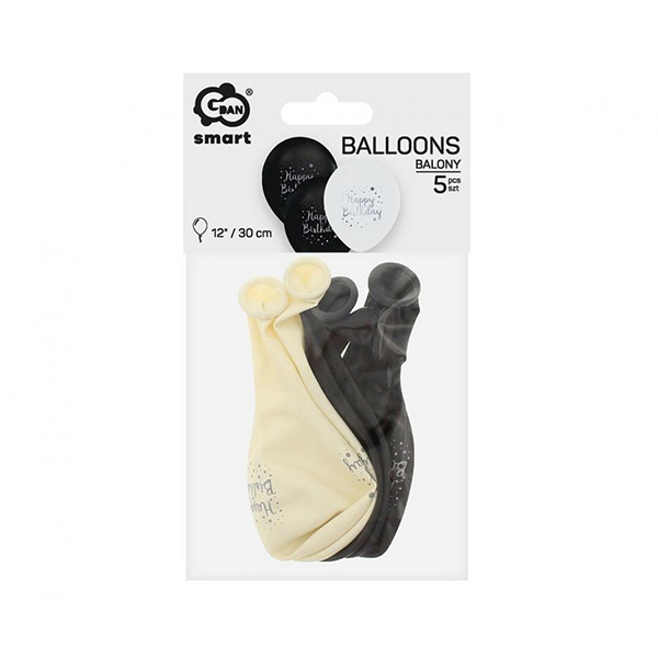Балони с печат Happy Birthday, бели и черни, 5 бр.