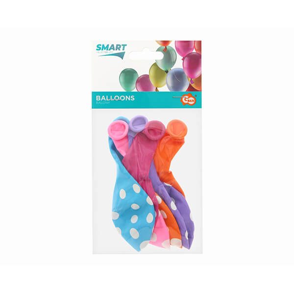 Цветни балони с принт на точки. Идеална за детски рожден ден и всеки друг повод. Балоните имат връх с подходяща дължина, така че лесно можете да ги завържете.