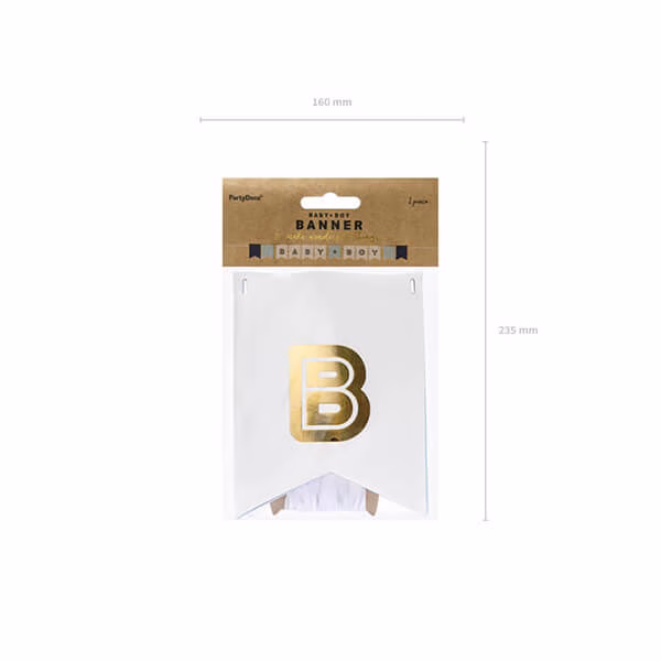 Банер Baby Boy, микс от цветове със златист надпис, за самостоятелно сглобяване, комплектът включва букви и около 2,5 м бяла панделка, размери след сгъване: височина около 15 см, дължина около 160 см.