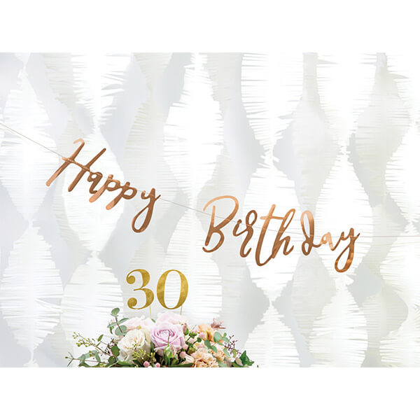 Банер Честит рожден ден от висококачествен огледален картон в розово злато с ръкописни букви Happy Birthday. Перфекетн банер за отпразнуването на рожден ден за всяка възраст.