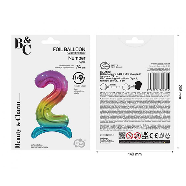 B&C стоящ фолио балон Цифра 2, дъга, 74 cm