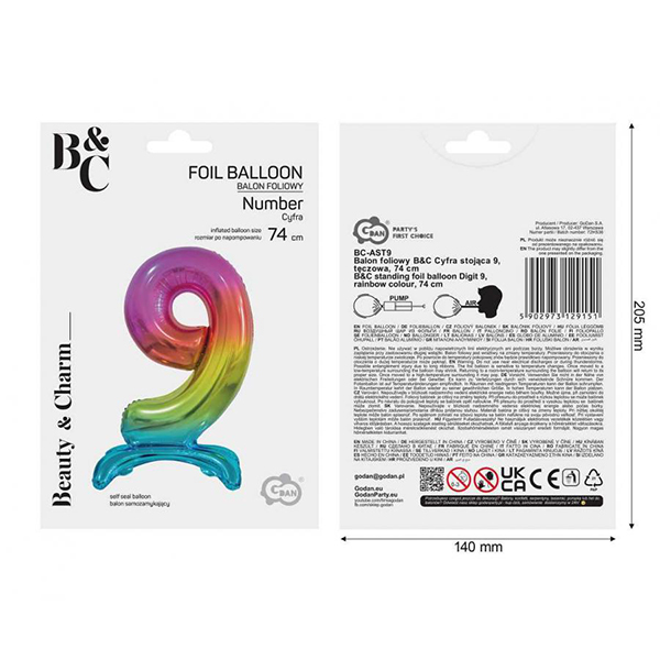 B&C стоящ фолио балон Цифра 9, дъга, 74 cm