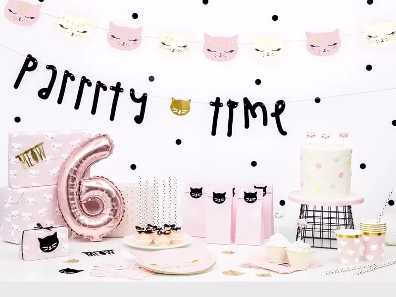 Висококачествени картонени чинии с форма на котешка глава в розов цвят със златен принт .