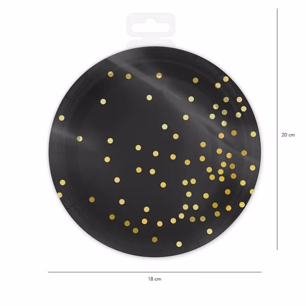 Черни картонени чинии с шарка на златни точки, диаметър около 18 см.