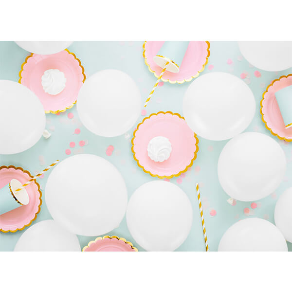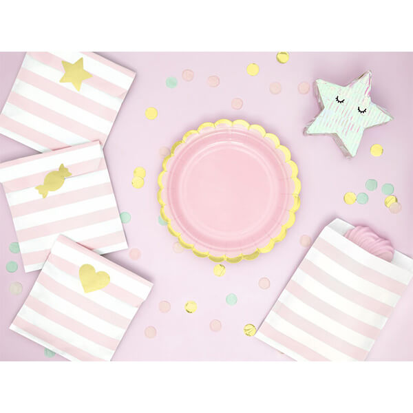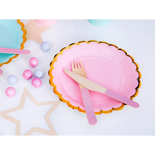 Висококачествени картонени чинии в светлорозов цвят със златен металиков кант със заоблени краища.