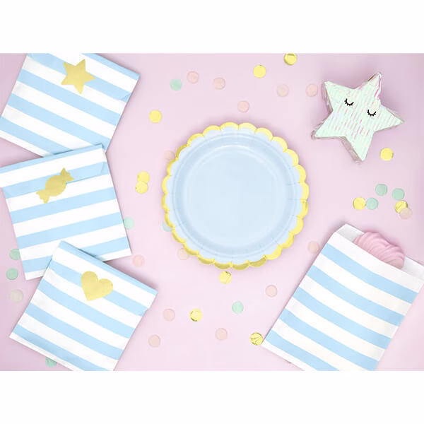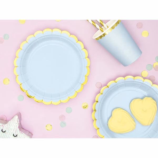 Картонени чинии, светлосини със златен кант, диаметър прибл. 18 см, (1 оп / 6 бр.)