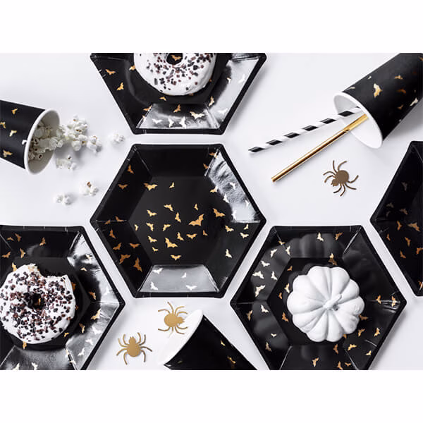 Чинии черни със златист принт с прилепи и диаметър прибл. 20 см, (1 оп / 6 бр.)