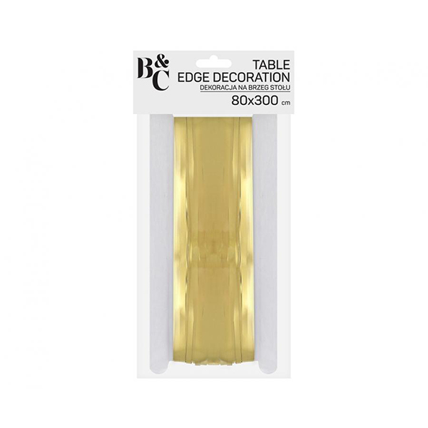 Декорацията за маса /пола за маса златни ресни/ от колекция Beauty&Charm е същността на елегантността, съчетана със забавление. Изработено от фолио в наситен, деликатен светлозлатист цвят, създава ефект на вълнообразни, метални ресни, които ще придадат уникален характер на всяко събитие. С дължина 300 см и височина 80 см, тази декорация е перфектна за украса на повечето маси, добавяйки им стил и елегантност. В случай на по-големи маси, винаги можете да добавите повече декорации, създавайки още по-ефектна аранжировка.