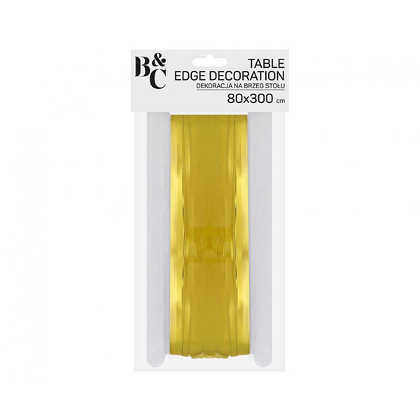 Декорацията за ръбове на масата / пола за маса от ресни/ от колекция Beauty&Charm е същността на елегантността, съчетана със забавление. Изработено от фолио в златист цвят, то създава ефект на вълнообразни, метални ресни, които ще придадат уникален характер на всяко събитие. С дължина 300 см и височина 80 см, тази декорация е перфектна за украса на повечето маси, добавяйки им стил и елегантност. В случай на по-големи маси, винаги можете да добавите повече декорации, създавайки още по-ефектна аранжировка.