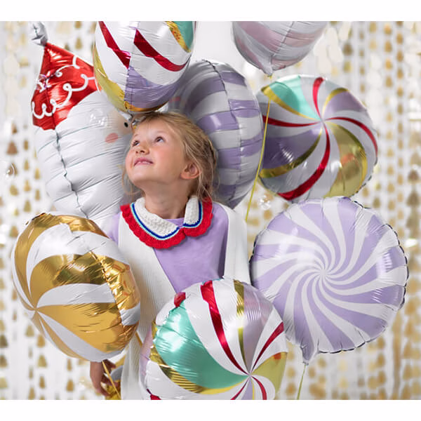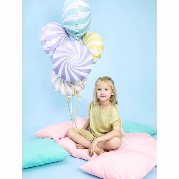 Сладък фолиев балон във формата на близалка от пастелно светло лилаво фолио Candy, микс от цветове (бяло и светло лилаво), размер преди надуване прибл. 45 см (18”), размер след надуване прибл. 35 см (14″). Надуйте с хелий и въздух.