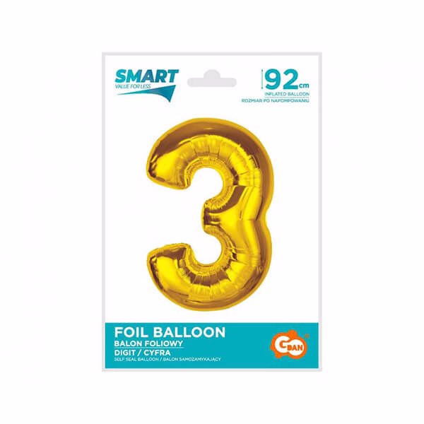 Фолиев балон Цифра 3, Smart, злато, 92 см