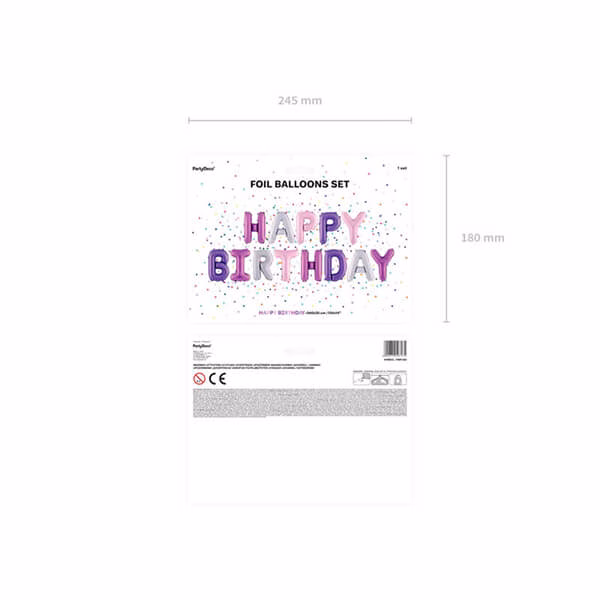 Комплект фолиеви балони с надпис “Happy Birthday” с височина на буквите 35см. Балоните се надуват един по един с помощта на сламка, след което се нанизват на лента и се окачват на предвиденото за целта място. Може да подредите балоните в един или два реда. В комплекта са включени сламка за надуване и лента за нанизване.