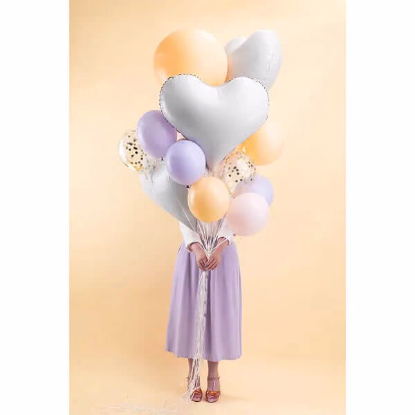 Фолиев балон Сърце в бял цвят, размер преди надуване 75 x 64,5 cm (29,5 x 25”), размер след надуване 61 x 53 cm (24 x 20.5”). Надуване с въздух и хелий. Комплектът съдържа сламка.