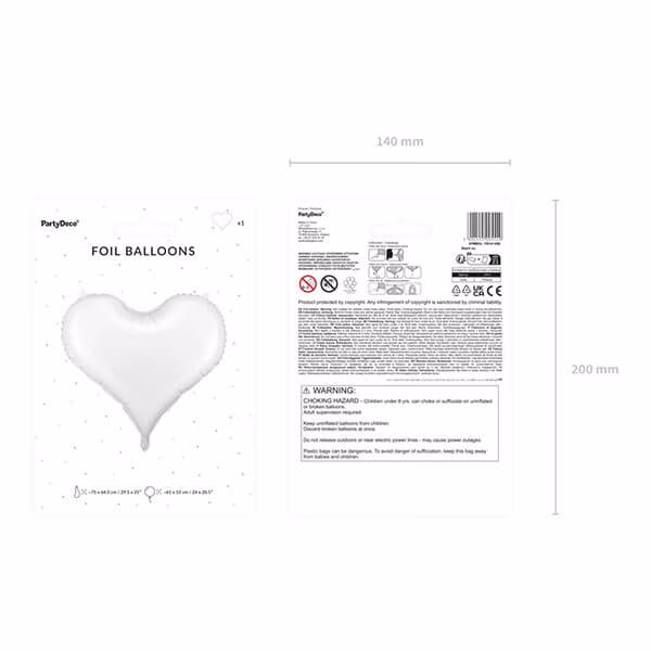 Фолиев балон във формата на сърце е романтично допълнение към всеки повод. Този конкретен балон сърце в бял цвят символизира чистота и невинност. Размерите му преди надуване са приблизително 75 x 64,5 см (29,5 x 25 инча), а когато се надуе, се намаляват до приблизително 61 x 53 см (24 x 20,5 инча). Този балон може да се надуе с хелий или въздух, което ви позволява да го настроите според вашите предпочитания. Изработен от устойчив фолиен материал, той е издръжлив и запазва привлекателния си вид за дълго време.