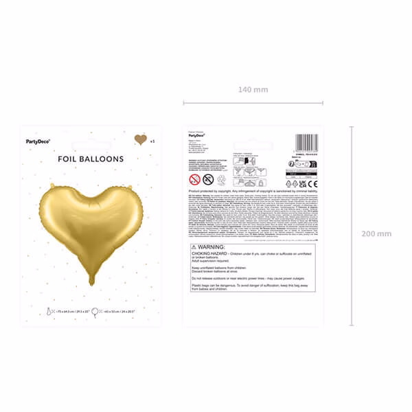 Балон от сатенирано фолио Сърце в златен цвят, размер преди надуване 74 x 64 cm (29 x 25″), размер след надуване 61 x 53 cm (24 x 20.5”). Надува се с въздух и хелий. Комплектът съдържа сламка.