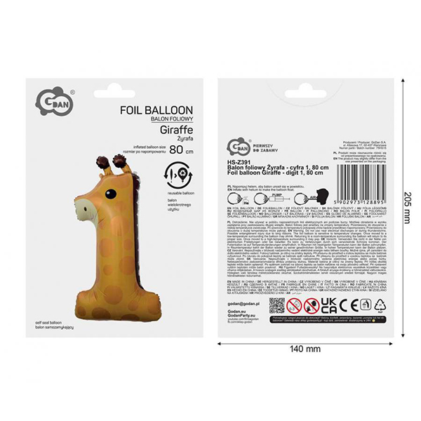 Фолиев балон Номер 1 с щампа на жирафче е перфектната декорация за детски рожден ден. Балонът е с височина 80 см, което го прави много ефектен. Балонът е изработен от здраво фолио и се носи дълго време. Балонът има самозатваряща се клапа, благодарение на която можете лесно да го напълните и да не губите ценен хелий или въздух.