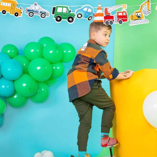 Гирляндът се състои от 7 различни цветни коли: жълт училищен автобус, сиво-синя полицейска кола, зелен джип, син бръмбар, червена пожарна кола, жълт самосвал и червен пикап. Комплектът включва и жълт багер. Страхотна парти украса за феновете на автомобилизма.