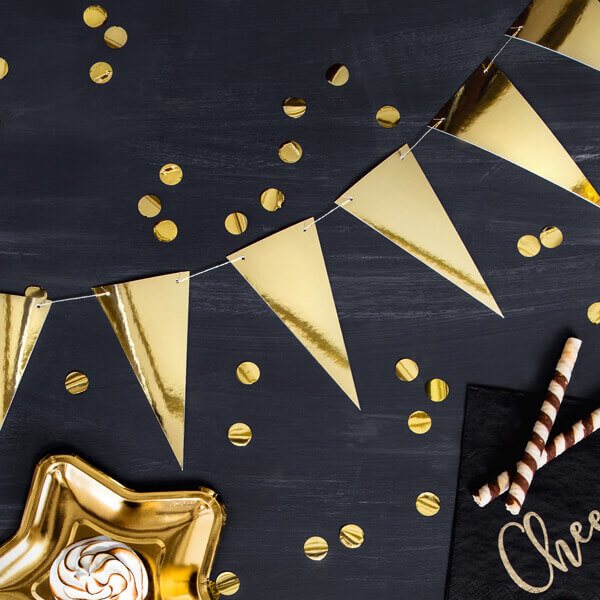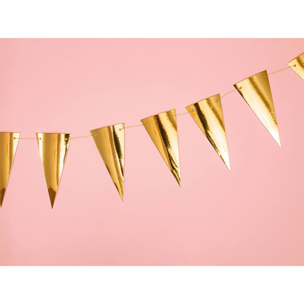 Флагчета, красив гирлянд в златист цвят, огледален, за самостоятелно сглобяване, комплектът включва 14 знамена и около 3 м златен шнур, размери: височина около 13 см, дължина около 2,15 м.