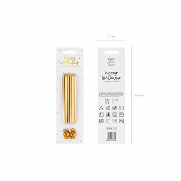 Свещи за рожден ден в златист металиков цвят, височина прибл. 12,5 см. Комплектът съдържа 12 свещи и поставки.