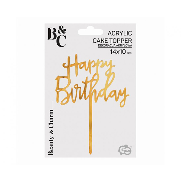 Happy Birthday акрилна украса за торта, злато, 14×10 см
