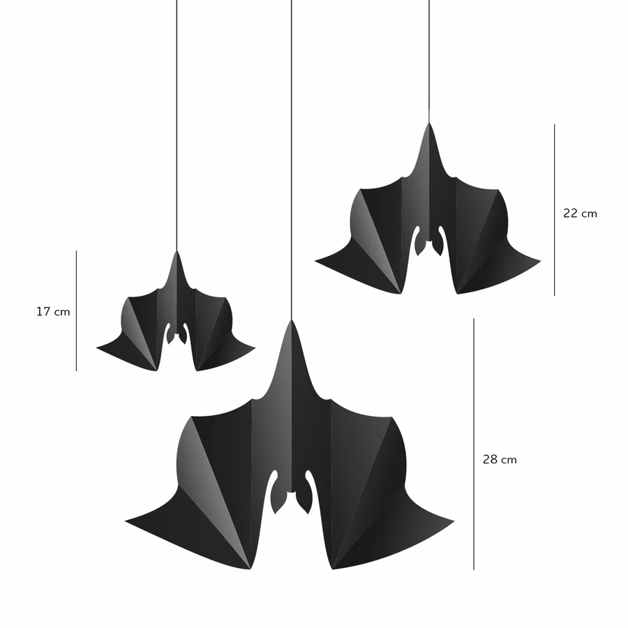 Комплектът включва 6 броя прилепи в 3 размера. Декорацията се отличава със семпла графика и идея, но формата е перфектна. Перфектна декорация за Хелоуин и декорация за парти на тема Батман.