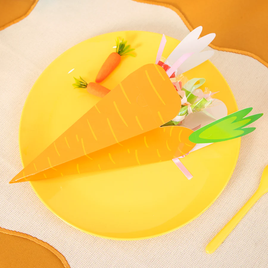 Вие закупувате 1 брой картонена фуния за лакомства с форма на Морков