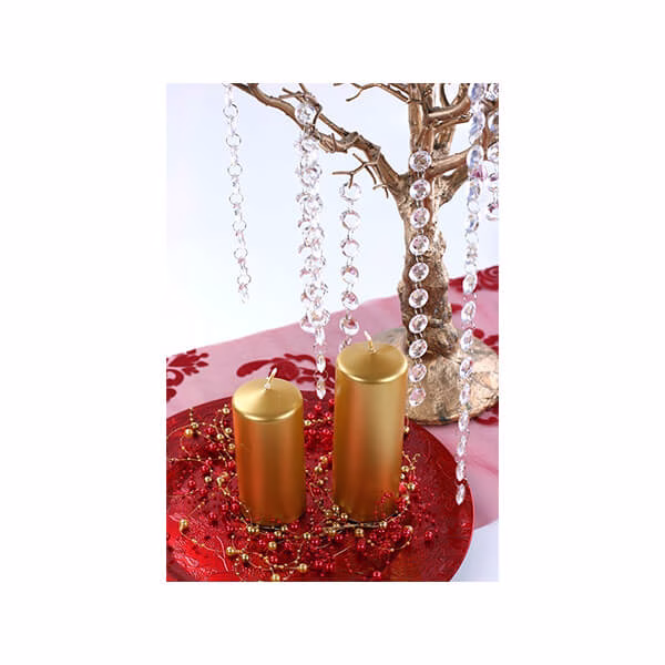Свещите са неразделна част от всяка сватбена украса. Тази цилиндрична златна свещ се откроява красиво на масата, придавайки на украсата луксозен вид. Тук ще намерите не само свещи за торта, но и декоративни свещи по тема или конични и цилиндрични свещи.