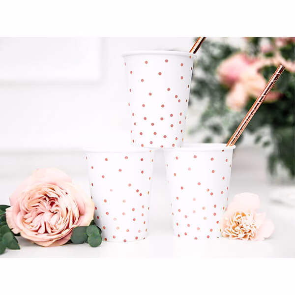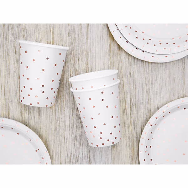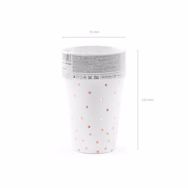 Бели картонени чаши с шарка на точки от розово злато, вместимост около 260 мл. Чашите за напитки носят маркировките, изисквани от Регламент за прилагане (ЕС) 2020/2151 на Комисията от 17 декември 2020 г. за установяване на правила относно хармонизирани спецификации по отношение на етикетирането на пластмасови продукти за еднократна употреба, изброени в част D от приложението към Директива на Европейския парламент и на Съвета (ЕС) 2019/904 относно намаляването на въздействието върху околната среда на някои пластмасови продукти. Продуктът съдържа етикет само на полски, немски, чешки, френски, холандски, словашки, словенски и български език.