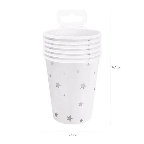 Картонени чаши със сребърни звезди, бели, 6 броя, в опаковка