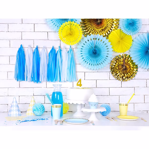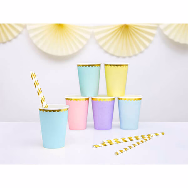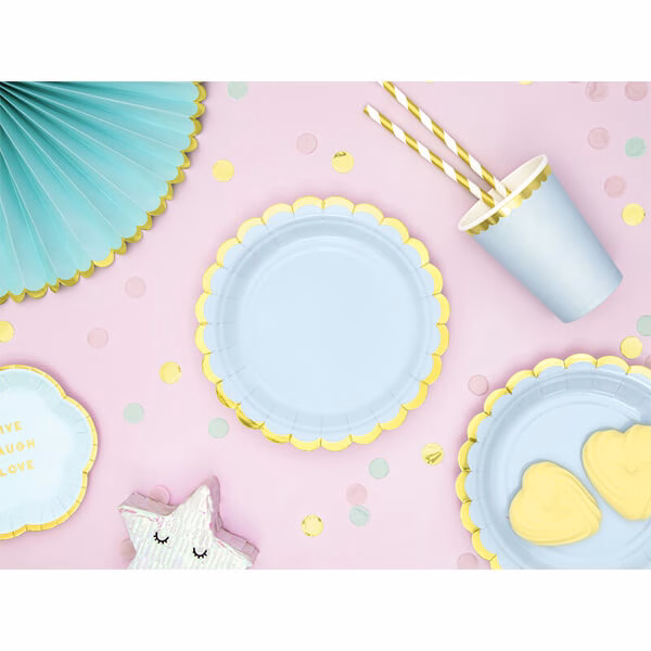 Картонени парти чаши в светлосин цвят с изчистен златен кант, 6 броя в опаковка.