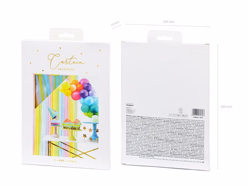 Впечатляваща, парти завеса в пастелни цветове. Можете лесно и удобно да фиксирате завесата с лепящата лента отгоре. Достатъчно е да отлепите защитната хартия и да залепите завесата на избраното място. Силното и в същото време безопасно лепило ще ви осигури трайно фиксиране на завесата и същевременно безпроблемно сваляне. Благодарение на подходящата дължина от 250см, можете да регулирате завесата на всяка врата, стена и други места. В същото време това е оптималната дължина, така че завесата няма да се заплита под краката и да събира прах от пода. Декоративната завеса е ефектна декорация за рожден ден, домашно парти, както и за фон на феноменална стена за правене на снимки на сватба, моминско парти и други събития. Използвайте ги, за да покриете част от апартамента, която “разваля” външния ви вид (например поради ремонт) или да го закачите на вратата, за да впечатлите приятелите си. „УАУ!“ гарантирано!