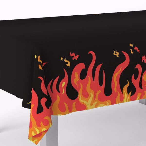 Черна парти покривка покривка с изгарящи пламъци, подходяща за украса рожден ден и други празнични поводи.