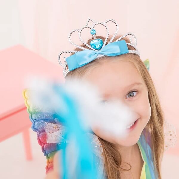 Допълнителен очарователен елемент е синята панделка , придаваща на короната още повече елегантност. Това е идеалният детайл, който ще накара всяка малка дама да се почувства специална по време на карнавалното парти. Децата обичат да играят ролята на принцеси, кралици или феи, а нашата диадема ще се превърне в ключов елемент от тяхната собствена приказна история. Може да се комбинира с аксесоар като магическа пръчка.