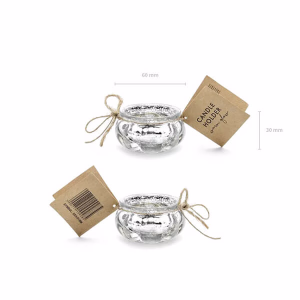 Високият 3 см стъклен свещник в сребристо е малък шедьовър, който излъчва елегантност и шик. Неговата деликатна форма и внимателна изработка го правят изключително очарователен и привличащ вниманието. Изработен от най-висококачествено стъкло, този свещник излъчва финес и изтънченост . Неговото огледално покритие му придава уникален блясък, който отразява магически светлината, създавайки атмосфера на топлина и интимност. Въпреки скромните си размери, този стъклен свещник е в състояние да създаде уникална атмосфера във всеки интериор. Поставен върху маса, рафт или скрин, той придава невероятен чар и придава на пространството финес и романтика. Неговата минималистична форма и се вписва идеално в различни интериорни стилове, от модерни до класически. Независимо дали искате да организирате романтична вечеря на свещи или да създадете уютна атмосфера за вечерна релаксация, този свещник ще бъде чудесен избор.