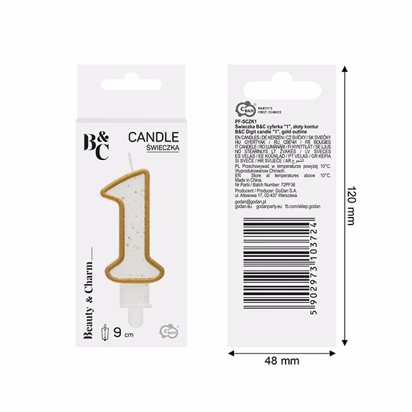 Красива свещ номер 1 в цвят злато е перфектната украса за всяка торта. Свещ във формата на числото 1 (eдно), украсена със златист контур. Благодарение на специалната поставка, свещта лесно се прикрепя върху тортата, благодарение на която цифрата е напълно видима. В допълнение, стъпалото на стойката осигурява допълнителна стабилност на свещта. Перфектната украса за тортата за деца и възрастни. Подходяща и за годишнини, фирмени събития и навсякъде, където можете да направите число или за комбинация на година от числа.