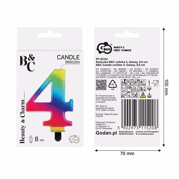Свещ цифра 4, дъга,Galaxy, 8 cm, чудесно се съчетава и с нашето разнообразие от парти колекции за всякакъв повод.