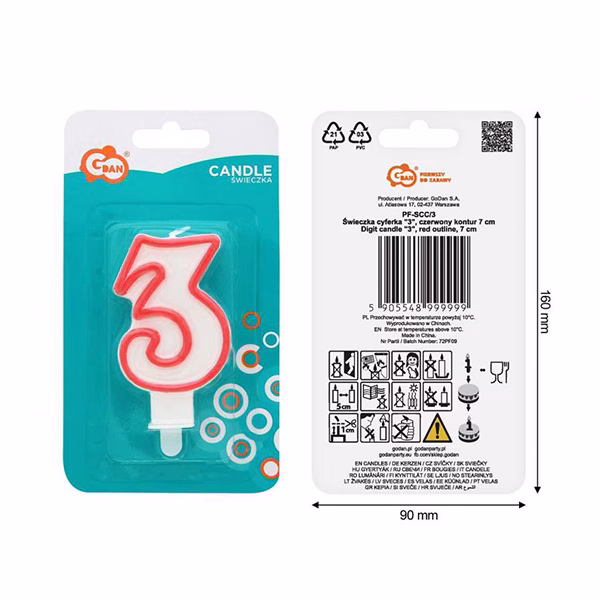 Хубава бяла свещ с червена рамка – числото “3” (три). Освен това разполага със стойка, която ви позволява да го закрепите към тортата, гарантирайки неговата стабилност. Красива декорация на торта за малки и големи рожденици и юбиляри. Също така ще бъде идеален за всякакви годишнини, фирмени банкети и навсякъде, където можете да подредите число или година от числа.