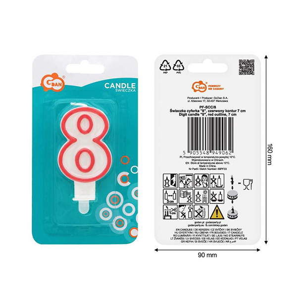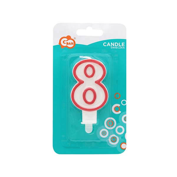 Хубава бяла свещ с червена рамка – числото “8” (осем). Освен това разполага със стойка, която ви позволява да го закрепите към тортата, гарантирайки неговата стабилност. Красива декорация на торта за малки и големи рожденици и юбиляри. Също така ще бъде идеален за всякакви годишнини, фирмени банкети и навсякъде, където можете да подредите число или година от числа.
