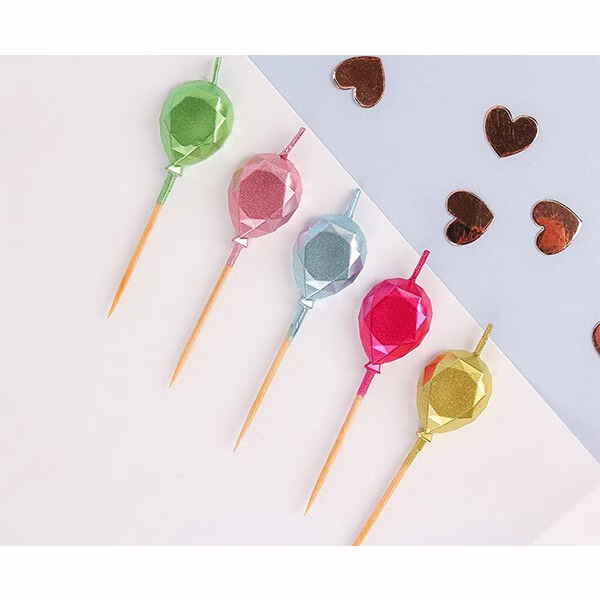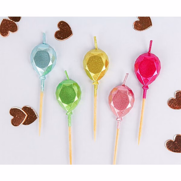 Свещи за торта във формата на балон. Прекрасен комплект свещи за рожден ден. Подходящата дължина, качествени запалими фитили, които ще ви позволят да запалите свещите бързо и лесно едновременно. Свещите горят достатъчно дълго, за да се насладите на празникачния момент докато гостите пеят Честит рожден ден. Свещите, прикрепени към практични клечки, ще стоят стабилно и ще изглеждат красиво върху торти, кексчета, мъфини и други печени изделия.