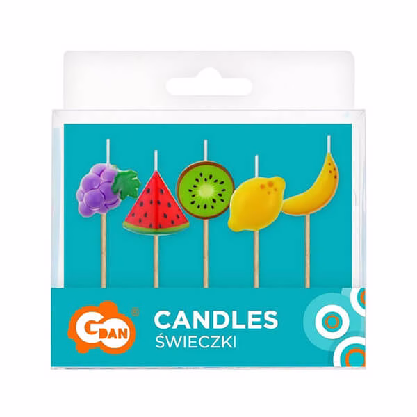 Свещи за торта във формата на плодове. Прекрасен комплект свещи за рожден ден. Подходящата дължина, качествени фитили, които ще ви позволят да запалите свещите бързо и лесно и едновременно. Свещите горят достатъчно дълго, за да се насладите на празникачния момент докато гостите пеят Честит рожден ден. Свещите, прикрепени към практични клечки, ще стоят стабилно и ще изглеждат невероятно върху торти, кексчета, мъфини и други вкусотийки.