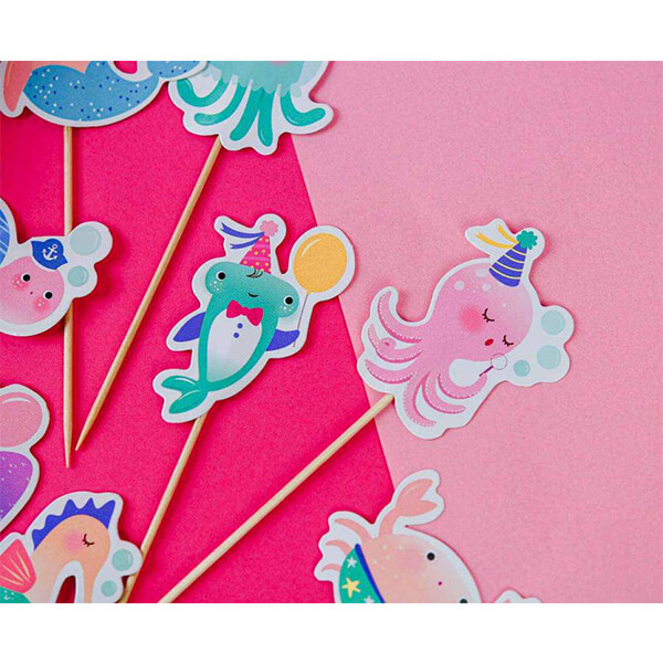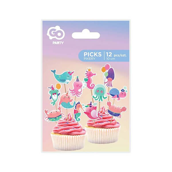 Декорацията за мъфини Подводен свят от 12 елемента е декорация, която със сигурност ще зарадва всяко дете. Сладките цветове на декоративните топери ще предизвикат апетита на децата на рожден ден, така че пригответе се и имайте под ръка голямо количество кексчета 🙂