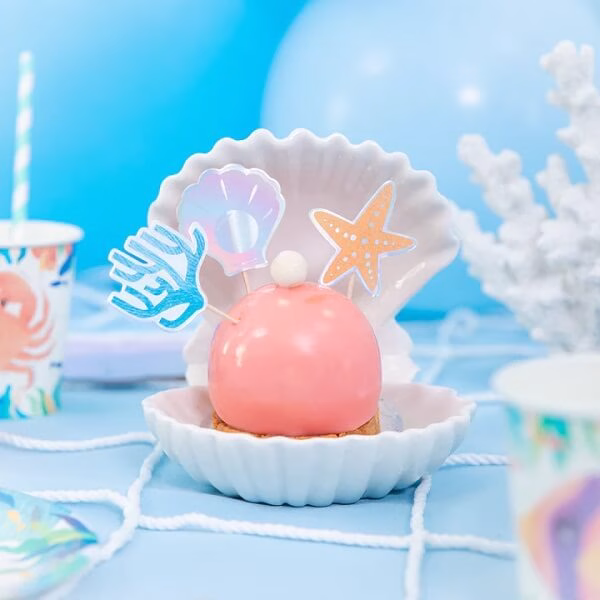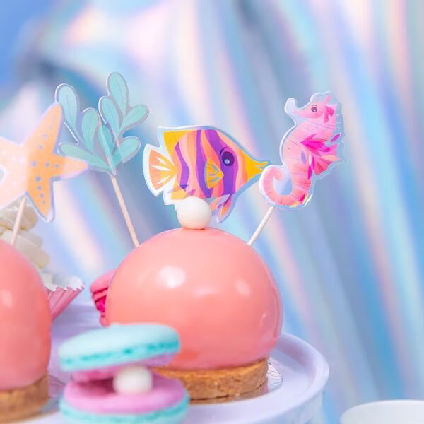 Сладките топери ще ви помогнат да създадете прекрасен подводен свят върху вашата торта или кексчета. Отличават се с пастелни цветове, подчертани от опалесциращи графични елементи, създаващи ефект на пречупване на слънчевата светлина под вода.
