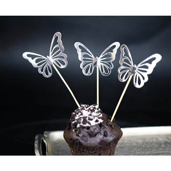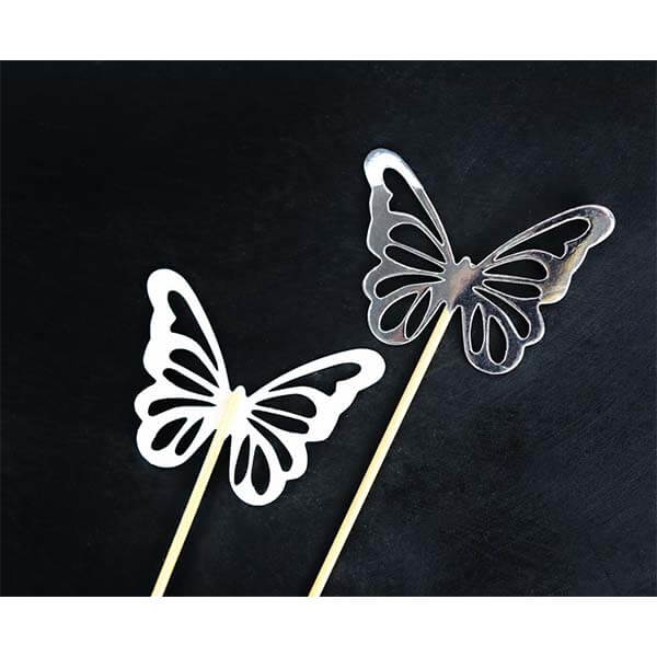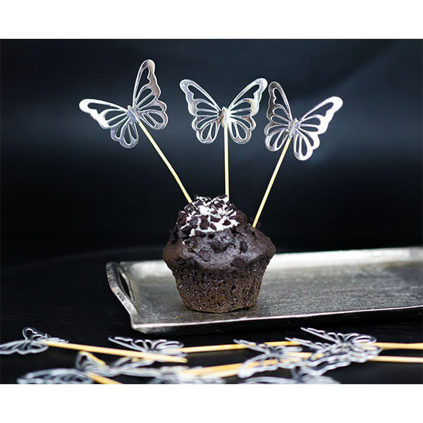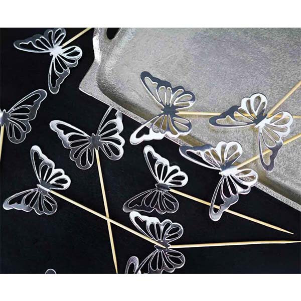 Топерите за декориране на мъфини и кексчета във формата на сребърни, ажурни пеперуди. Пеперудите искрят красиво на светлината, придавайки невероятен ефект. Красива украса за сватба, моминско парти, рожден ден, имен ден. Топерите пеперуди са украса за торта, която можете да украсите с кексчета, мъфини, торта и други изкушения. Те могат успешно да заменят свещите за торта или да бъдат красиво допълнение към тях.